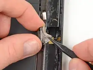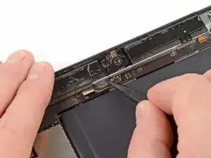 Антенна прикреплена к нижней части iPad винтами и кабелем. Этот шаг отсоединяет антенну от передней панели, гарантируя, что при снятии панели антенна не будет повреждена.