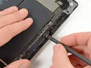 Проведите медиатором вдоль левого края iPad, освобождая клей по ходу. Здесь клей тонкий из‑за дигитайзера вдоль всей левой стороны. Убедитесь, что медиатор не введён слишком глубоко (макс. 1/2 дюйма, 10 мм), чтобы не повредить дигитайзер.