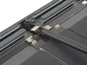 Отключите два видимых гибких кабеля дисплея с помощью лопатки, аккуратно поддев их вертикально вверх из разъёмов.