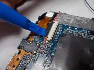 Чтобы отключить разъём, используйте лопаточку iFixit, чтобы приподнять чёрную защёлку. Чёрная защёлка показана красными стрелками на фото.