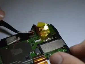 С помощью пинцета поднимите желтую ленту, скрывающую фронтальную камеру.