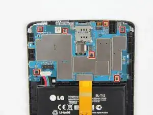 Удалите 7 черных винтов PH0 по 3 мм с материнской платы (красные маркеры).