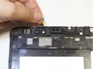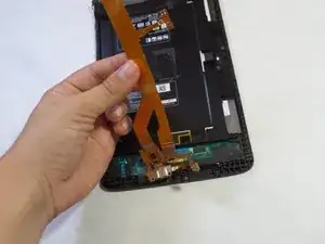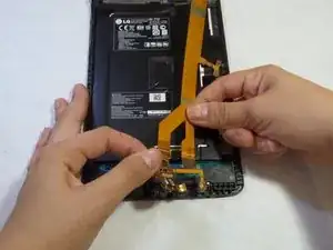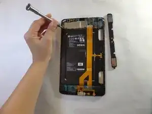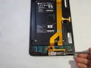 Используя лопатку или пластиковый инструмент для вскрытия, отсоедините ленточный кабель с правой стороны устройства.