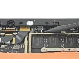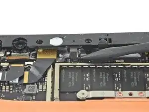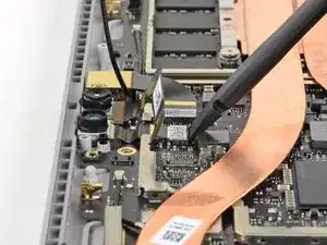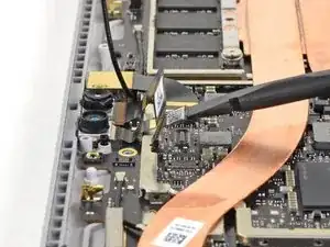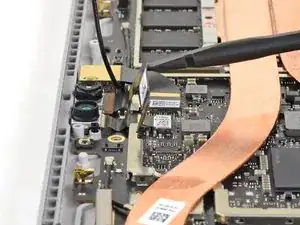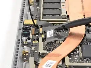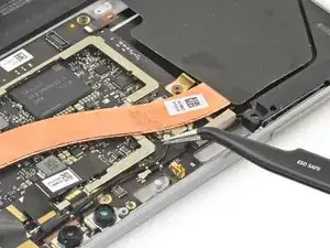 Используйте пинцет, чтобы отогнуть серебристую ленту, фиксирующую правый шлейф дисплея на материнской плате.