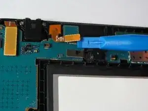 Немного надавите и переместите синий пластиковый инструмент вниз, чтобы вытащить золотой прямоугольный разъём фронтальной камеры из гнезда на материнской плате.