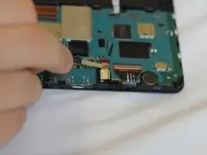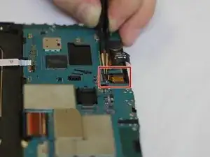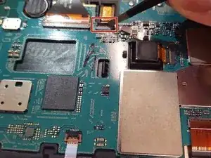 Снимите шлейфы, соединяющие камеру с материнской платой, используя пинцет, чтобы отогнуть черный замок от камеры (в сторону нижней части планшета).
