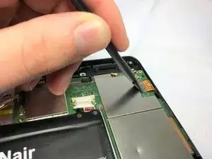 Отсоедините шлейф, соединяющий плату разъёма зарядки с материнской платой, используя пинцет.
