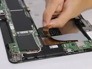 Правый ленточный кабель подключён к ZIF-разъёму. Используйте плоский конец лопатки, чтобы приподнять маленькую запорную планку, затем вытяните кабель.