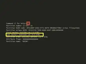 Введите i и номер раздела. В этом выводе всё, кроме Последнего сектора и Размер раздела, должно совпадать с информацией, которую вы скопировали сейчас.