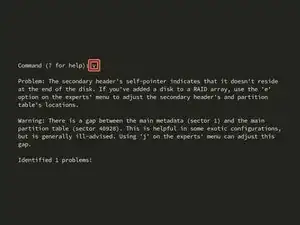 Нажав v, вы можете проверить таблицу разделов на SD‑карте. Появится одна ошибка и одно предупреждение.