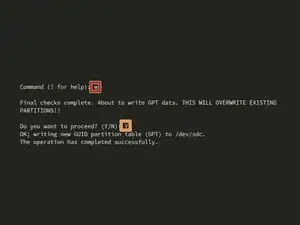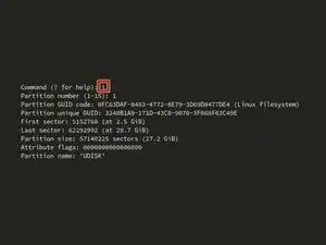 Откройте gdisk для редактирования разделов: gdisk /dev/sdX, где /dev/sdX — файл устройства USB. В моём случае это либо sdb, либо sdc.