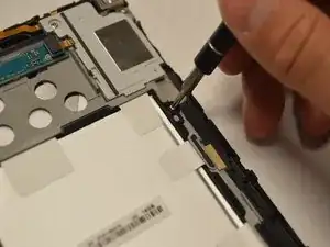 Удалите два шлейфа, которые лежат поперек аккумулятора и подключены к материнской плате. Поместите палец под шлейф и аккуратно поднимите его вверх и снимите.