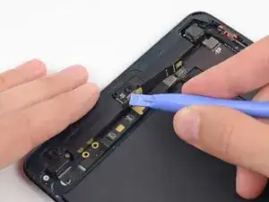 Используйте пластиковый инструмент для открывания, чтобы аккуратно поддеть нижнюю металлическую пластину и приподнять её от разъема кабеля разъема для наушников.