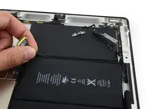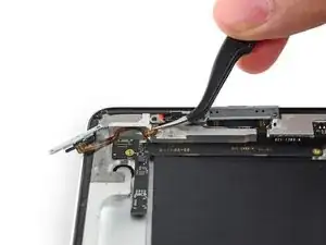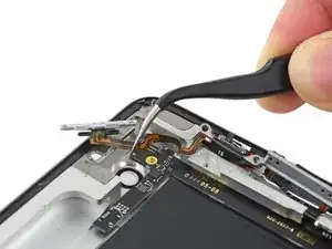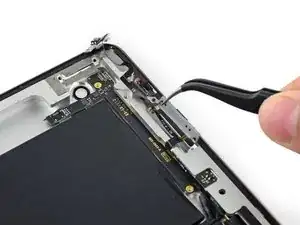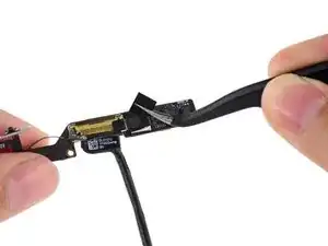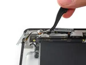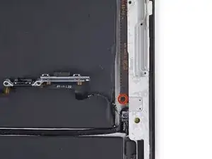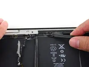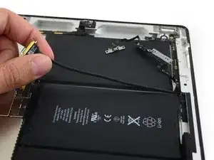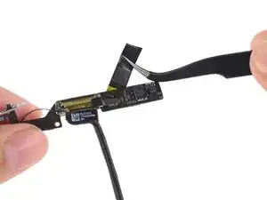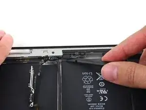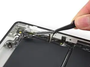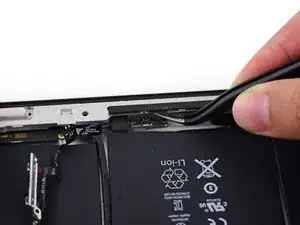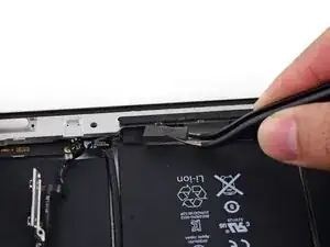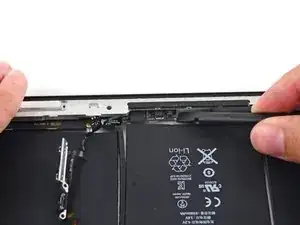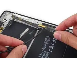 Антенна прикреплена к нижней части iPad с помощью винтов и кабеля. Этот шаг отделяет антенну от передней панели, гарантируя, что при снятии панели антенна не будет повреждена.