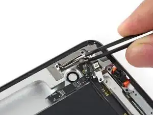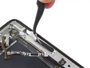 Вставьте острый конец инструмента для открытия между переключателем блокировки поворота/беззвучным режимом и его скобой, чтобы разрезать клей в этой области.