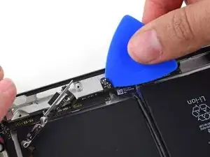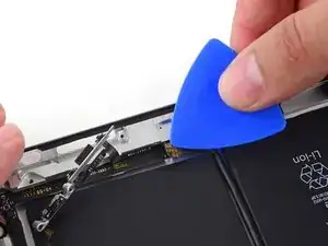 Используя медиатор, который всё ещё находится под нижним краем iPad, освободите клей по нижнему левому углу.