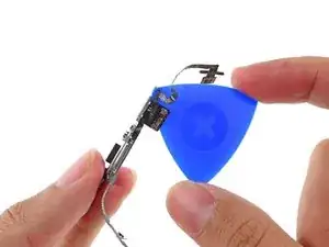 Используйте пластиковый рычаг, чтобы поддеть разъём шлейфа задней камеры и отсоединить его от платы управления.