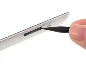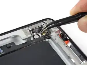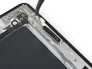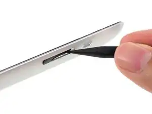 Вставьте острие медиатора для вскрытия между переключателем блокировки поворота/беззвучным переключателем и его скобой, чтобы разрезать там клей.