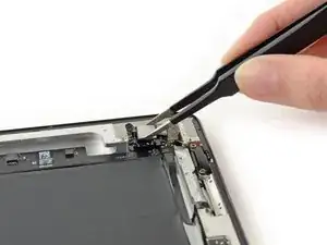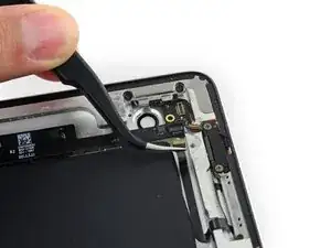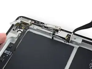 Антенна прикреплена к нижней части iPad винтами и кабелем. Этот шаг отсоединяет антенну от передней панели, чтобы при снятии панели антенна не была повреждена.