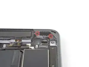 Отверткой Phillips отверните два винта длиной 2,3 мм, фиксирующих кронштейн кнопки регулировки громкости к задней крышке.