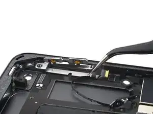 Используйте пинцет, чтобы отслоить ленточный кабель кнопки «Домой» от рамки.