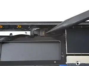 Используйте наконечник лопатки, инструмент для вскрытия или ноготь, чтобы поднять небольшой шарнирный фиксатор на ZIF-коннекторе кабеля управления кнопками.