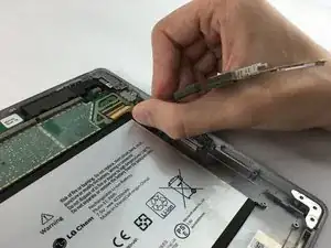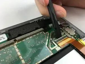 Используйте пластиковую лопатку, чтобы отжать фиксирующий зажим от кабеля дисплея.