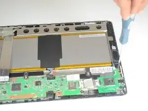 Извлеките аккумулятор из устройства. После извлечения используйте пластиковый инструмент, чтобы отделить металлическую рамку от аккумулятора.