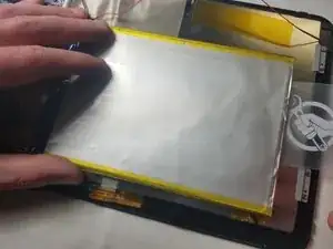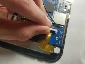 Снимите жёлкую ленту, удерживающую аккумулятор на устройстве, с помощью пальцев или, при необходимости, пластикового инструмента для вскрытия.