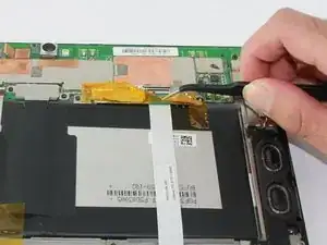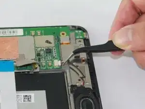 Захватите пинцетом кабель динамика рядом с белой клеммой и потяните, чтобы отсоединить его.