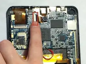 Камера расположена в верхней части устройства и крепится одним винтом длиной 3,75 мм, который находится внутри красного круга, а также одним защёлкивающимся креплением, указанным внутри оранжевого прямоугольника.