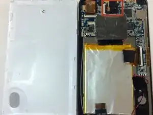 Используйте пластиковый инструмент для вскрытия или чёрную лопатку, чтобы приподнять заднюю крышку и снять её с планшета.