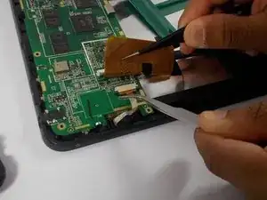 Вторым пинцетом аккуратно вытащите золотую пластину, соединённую с камерой, из платы.