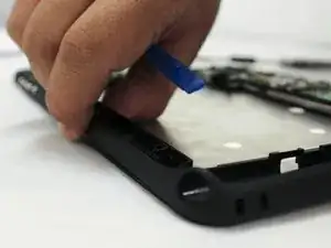 Используя руки или синюю пластиковую лопатку, пройдите вдоль краев рамки и отсоедините экран от средней рамки.