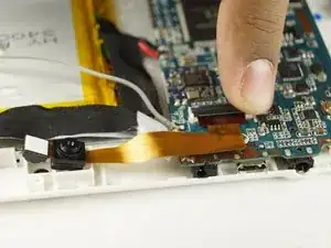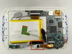 Найдите камеру в верхней части устройства. Обратите внимание на пластиковую защёлку, удерживающую её на месте.