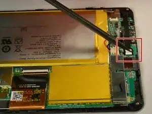 Найдите небольшой серый разъём в верхней части устройства. С помощью лопатки аккуратно оттяните его от устройства, пока соединение не освободится.
