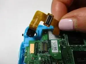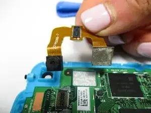 Удалите плоский разъем, соединяющий камеры с материнской платой, с помощью пластикового инструмента для открытия, подковырнув с обеих сторон.