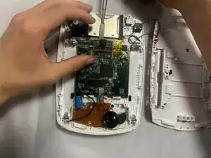 Отделите материнскую плату от задней стороны устройства, отсоединив черное и красное проводное соединение от задней крышки.