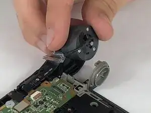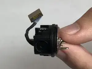 Корпус камеры фиксируется штифтом в центре серого кронштейна шарнира. Нажмите и удерживайте штифт острым концом лопатки, пока вы аккуратно вынимаете сборку камеры.