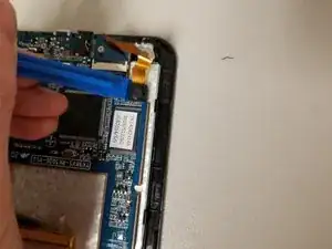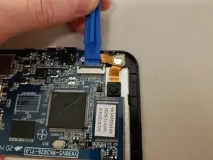 Задний модуль камеры планшета закреплён на устройстве с помощью сильного клея. Вставьте ваш пластиковый инструмент для открытия под задний модуль камеры и аккуратно приподнимите, пока он не освободится от клея. Теперь вы можете удалить весь узел камеры.