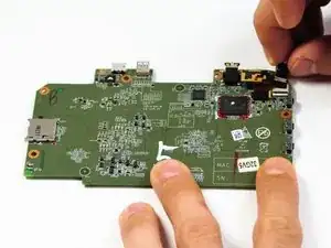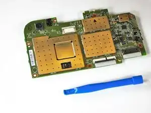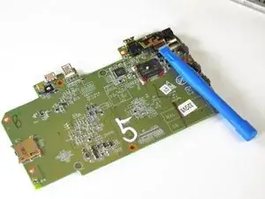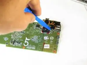 Используйте маленький пластиковый инструмент для того, чтобы открыть разъем фронтальной камеры от материнской платы.