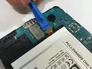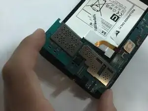 Удалите материнскую плату, вращая её от остальной части телефона, как показано на первом фото.