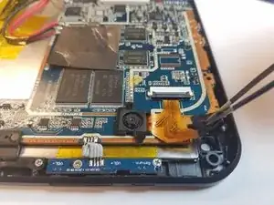 Динамики прикреплены к внутренней стороне задней крышки и соединены проводами с материнской платой планшета. Будьте осторожны, чтобы не оторвать их при снятии задней крышки.