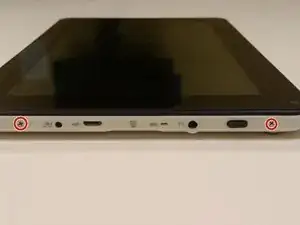С выключенным планшетом удалите два винта с головкой Phillips длиной 5 мм с верхней части планшета.