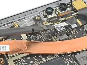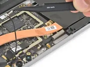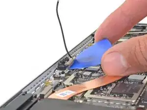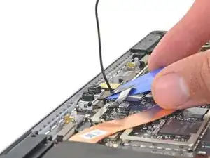 С помощью пинцета отогните серебристую ленту, фиксирующую правый кабель дисплея к плате.