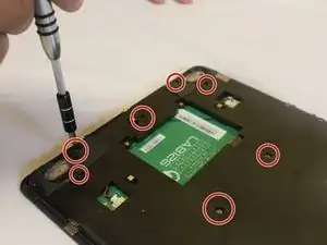 Используя края инструмента для вскрытия, подденьте по шву между передней и задней панелями и разъедините детали. Когда они ослабнут, снимите заднюю панель с устройства.