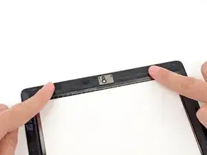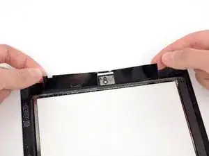 Поместите клеевую полоску в форме моста между верхним краем внутренней рамки передней панели и креплением камеры.