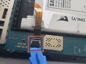 Используйте пластиковый инструмент для вскрытия, чтобы отвести вверх фиксирующий язычок ZIF-разъёма батареи.