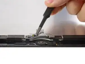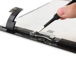 Используйте плоский конец монтажной лопатки, чтобы поднять фиксирующий язычок в гнезде кабеля кнопки «Домой».
