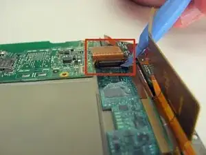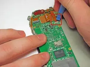 Используйте пластиковый инструмент для раскрытия, чтобы аккуратно поддеть кабель у небольшой платы и отсоединить его от контактов.